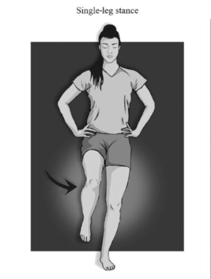 Les six tests fonctionnels incluent le test de station debout sur une jambe (SLS) sur une surface ferme, le test d'équilibre en étoile modifié (mSEBT), le test de saut latéral (SHT) et le test en huit (F8T).